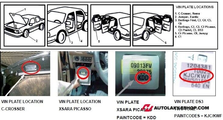 Na vozidle Citroen nájdete kód farby na stĺpiku dverí vodiča alebo spolujazdca, môže sa nachádzať aj pod volantom na kryte poistkovej skrinky alebo v motorovom priestore, najčastejšie v úžitkových vozidlách.