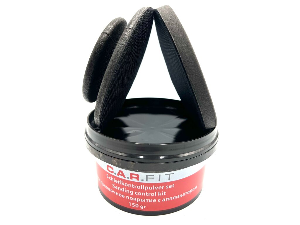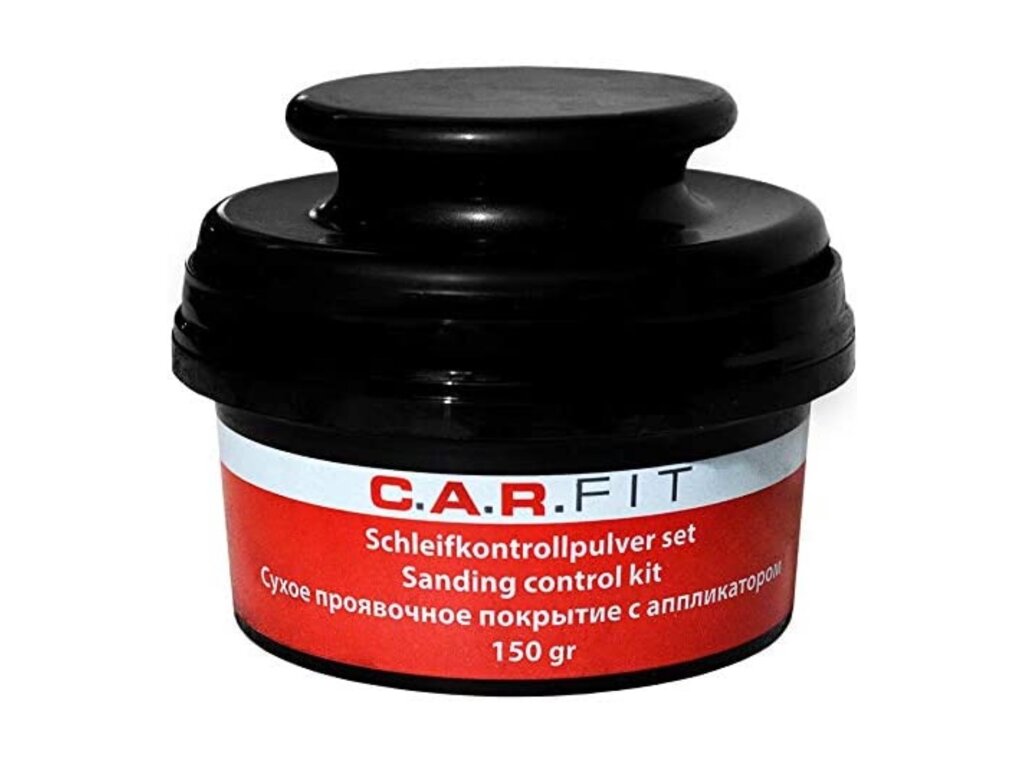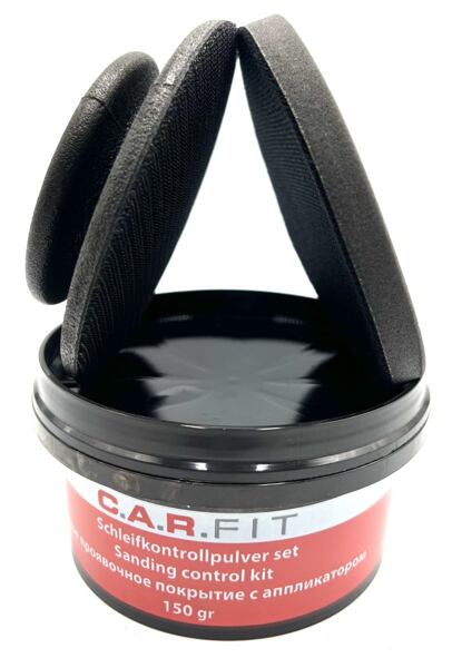 Nie je potrebné miesto zakrývať ani čakať na zaschnutie. Jednoducho naneste suchý prášok C.A.R.Fit v primeranom množstve pomocou aplikátora. Potom môžete ihneď brúsiť a odhaliť nerovnomerné výbežky. Aplikačná hubka má priemer 11 cm a dá sa ľahko vymeniť - zapínanie na suchý zips.