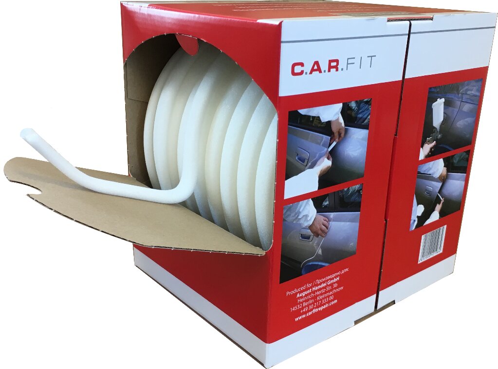 Penová páska C.A.R.Fit sa dodáva v krabici v pásoch dlhých 5 m a širokých 13 mm. Vhodné podklady sú guma, sklo, kovové diely, pochrómované povrchy, OEM/finiš.