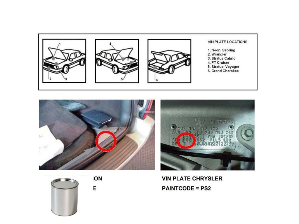 Môže sa stať, že z nejakého dôvodu štítok s kódom farby chýba, v takom prípade sa môžete telefonicky obrátiť na ktoréhokoľvek predajcu Chrysler alebo autorizovaný servis, kde vám na základe čísla VIN bezplatne poskytnú kód farby.