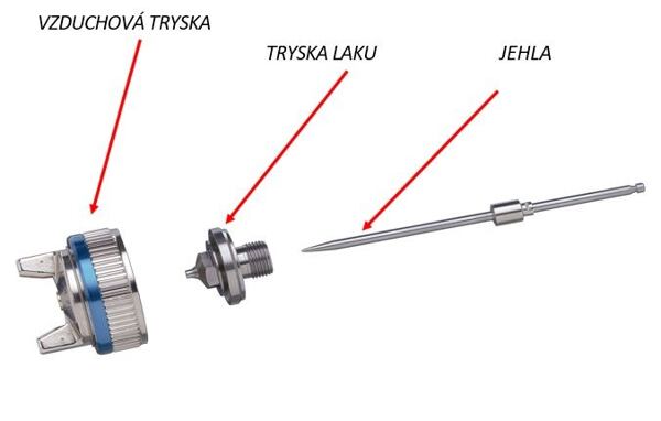 Ďalej je to tryska na farbu, do ktorej zapadá ihla, a musí byť plne kompatibilná s ihlou; cez otvory po obvode tejto trysky už prúdi stlačený vzduch a treba dbať na ich správne a šetrné čistenie.