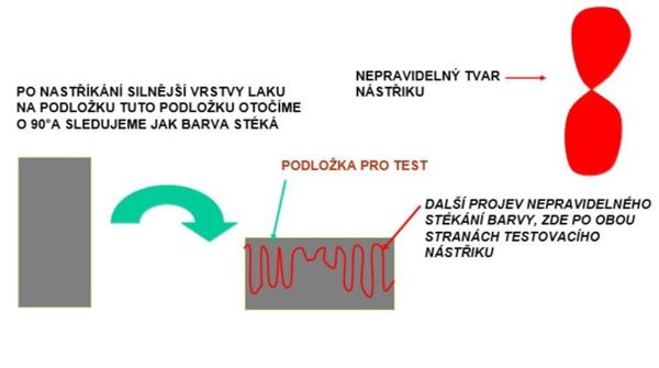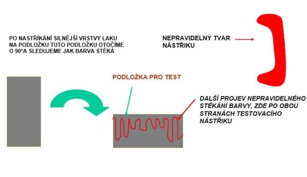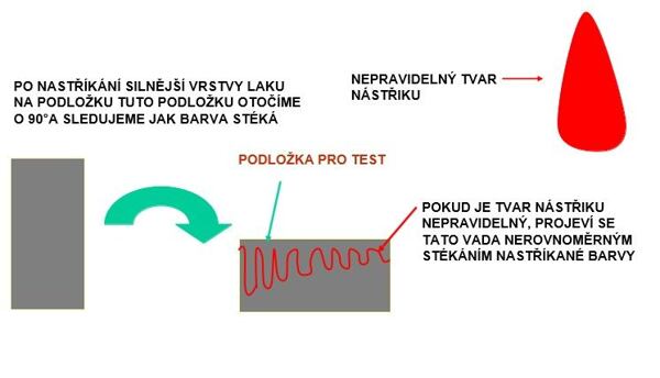 Ak ste dodržali opísané nastavenia a tvar kužeľa je podobný tvaru zobrazenému na obrázkoch nižšie, alebo ak farba steká nerovnomerne pri otočení skúšobnej plochy o 90°, chyba je v niektorej zo súčastí striekacej pištole. Môžu nastať tri situácie znázornené na obrázkoch. Všetky však poukazujú na neúmerné množstvo farby, ktoré sa usadzuje na lakovanom povrchu.