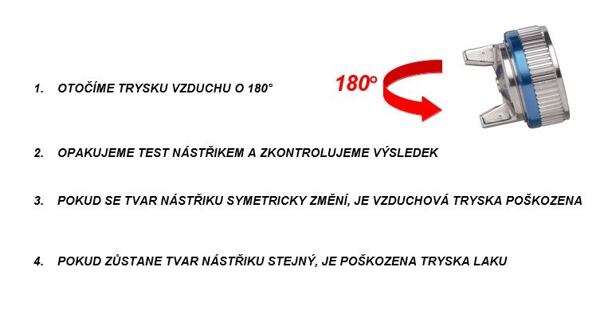 Príčinou zlého striekania môže byť poškodená alebo znečistená vzduchová tryska alebo tryska na farbu. To sa dá zistiť jednoduchým testom. Otočte vzduchovú trysku o 180° a zopakujte test. Ak sa vzor striekania otáča symetricky, na vine je vzduchová tryska. Ak nie, na vine je tryska na farbu. Ak je všetko dôkladne vyčistené, pomôže len výmena poškodenej časti.