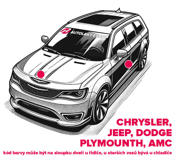 Na vozidlách Chrysler nájdete štítok s kódom farby na stĺpiku dverí vodiča, v kufri alebo v blízkosti chladiča.