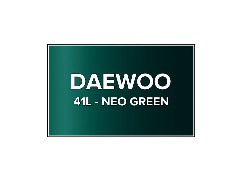 Přečíst článekZelená metalíza Daewoo 41L Neo Green na pištole v 100 ml balení. Farba NEO GREEN presne zodpovedá autolaku 41L, ktorý sa používal na vozidlách Daewoo v rokoch 1995-2002. Farba na všetky povrchy, jednoduchá aplikácia, 100% krytie.