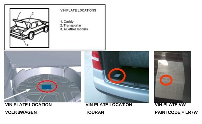 Pri vozidlách Volkswagen nájdete kód farby v batožinovom priestore pri rezervnom kolese na papierovom štítku, štítok sa môže nachádzať aj v užívateľskej príručke na prvej strane. Pozor však na úžitkové modely alebo dodávky (VW Transporter, VW Sharan atď.), štítok s kódom farby sa zvyčajne nachádza pod volantom, nalepený na vnútornej strane krytu poistkovej skrinky. Pri starších modeloch môže byť nalepený na ráme sedadla.
