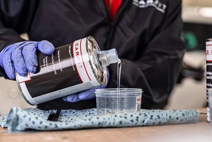 1. Odmastite poškodené miesto silikónovým čistiacim prostriedkom - nepoužívajte riedidlá, technické benzíny atď. Môžu povrch leptať a nemajú schopnosť viazať mastnotu, ktorú nimi môžete pohodlne zotrieť.