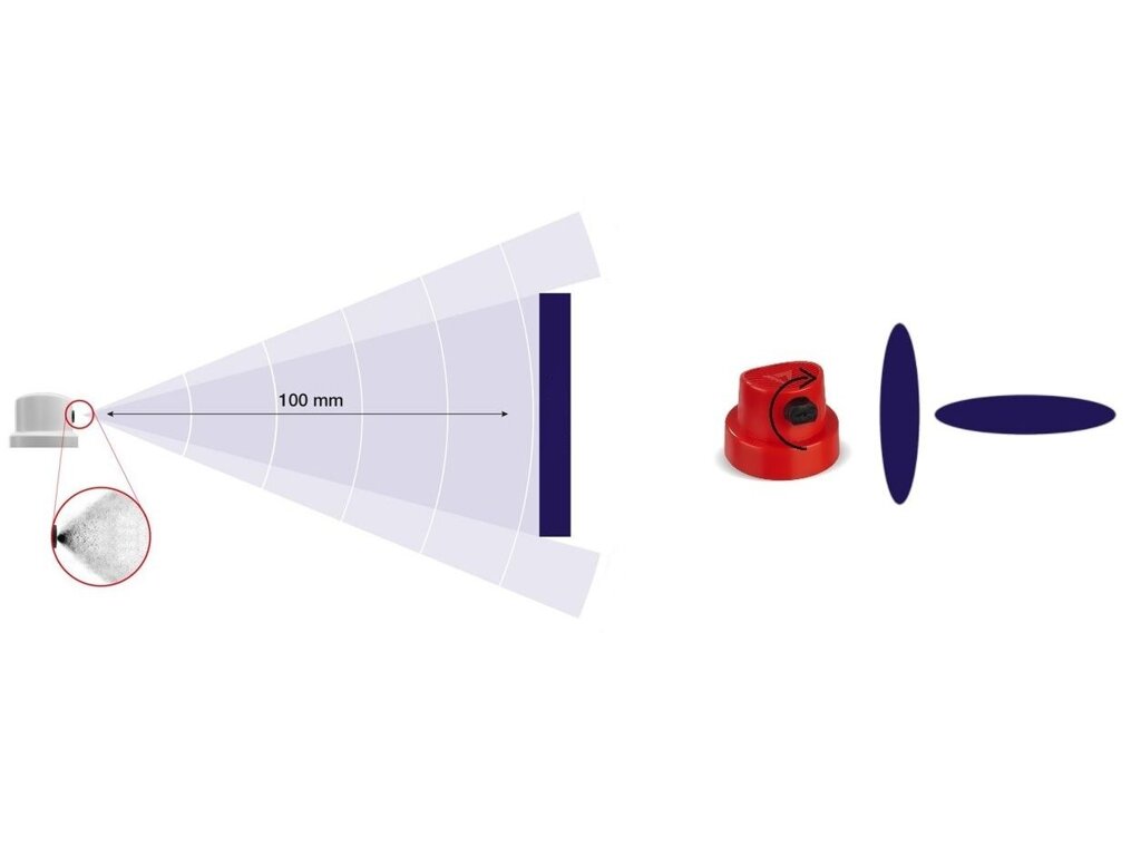 Naše spreje sú vybavené špeciálnou variabilnou tryskou, ktorá umožňuje nastaviť trojuholníkový rozprašovač farby do akejkoľvek horizontálnej alebo vertikálnej polohy.