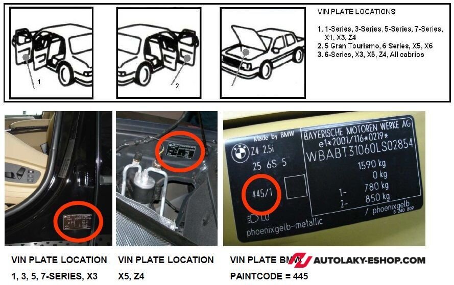Na vozidlách BMW nájdete kód farby v motorovom priestore alebo na strane dverí vodiča alebo spolujazdca, ale zvyčajne nie je žiadne iné miesto, kde by ste mohli nájsť štítok s kódom.