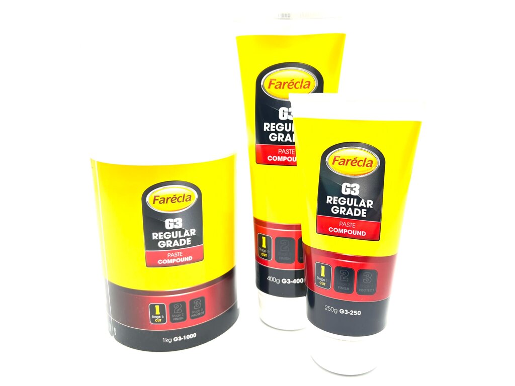 na rýchle odstránenie abrazívnych škrabancov a dosiahnutie lesku v jednom kroku. Vyznačuje sa minimálnou prašnosťou a vynikajúcou abrazívnou schopnosťou. Pasta Farecla G3 je vhodná na všetky typy autolakov.
