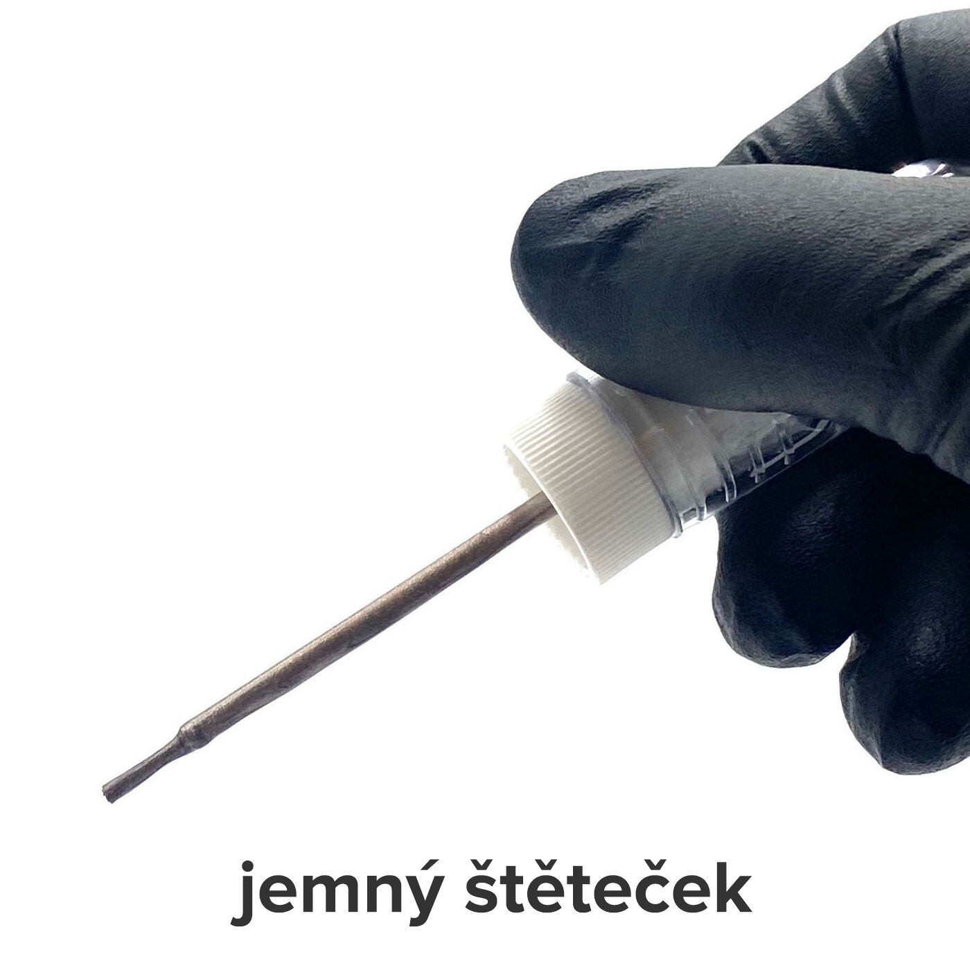 Po odskrutkovaní bieleho uzáveru vytiahnite štetec, ktorý je umiestnený vo vnútri fľaštičky (ako je zvykom pri lakoch na nechty). Teraz môžete pohodlne opraviť väčšie vleklé poškodenia, ako sú škrabance v laku alebo iné defekty, ktoré by sa ťažšie opravovali retušovacím hrotom.
