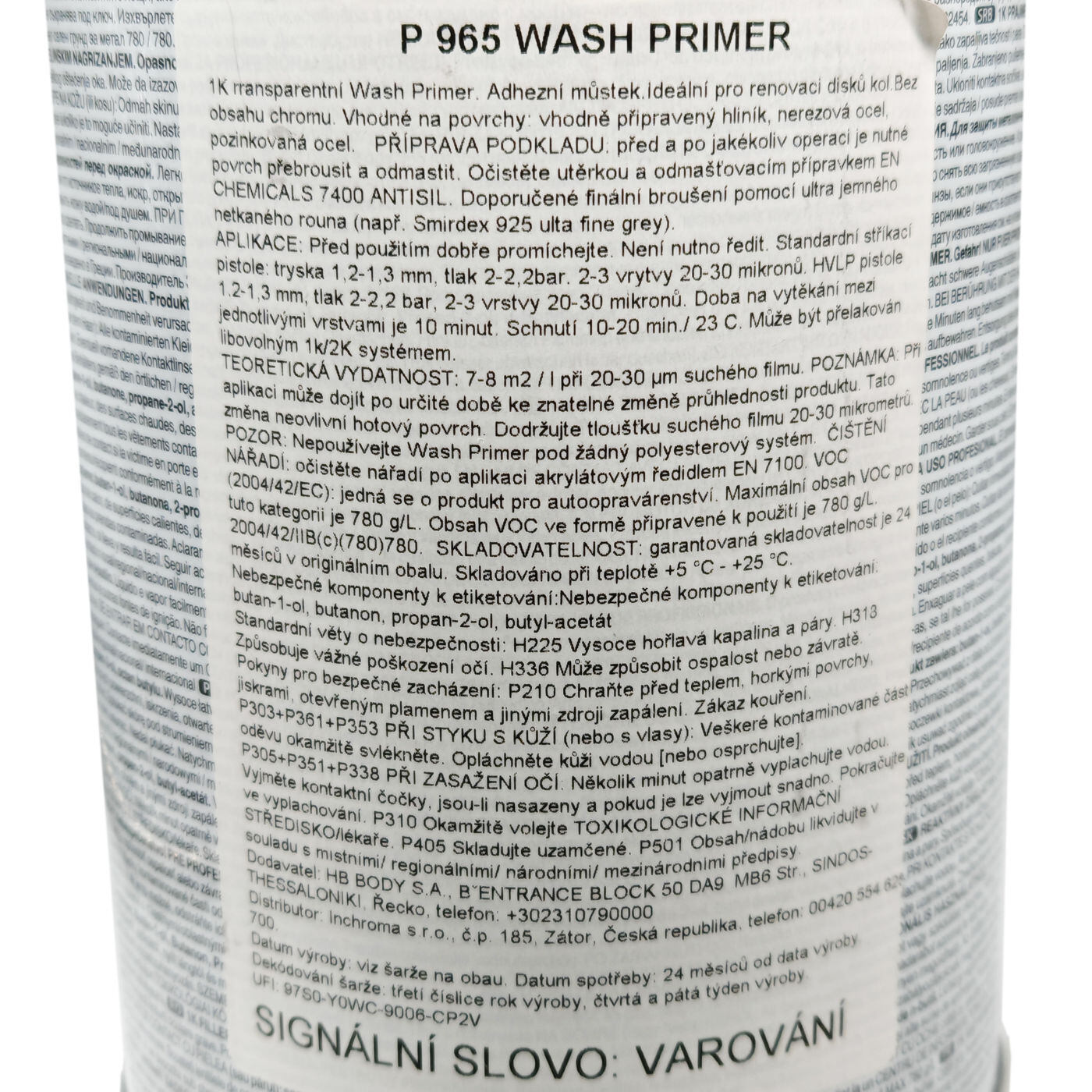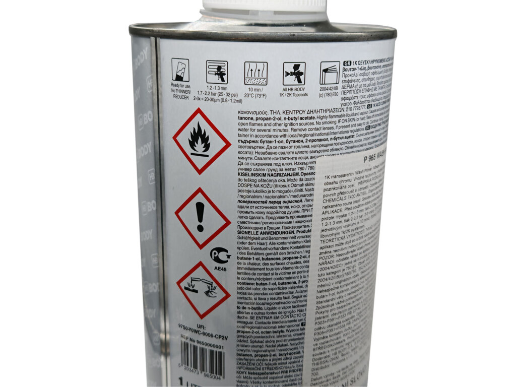 Naneste jednozložkový (takže nie je potrebný žiadny aktivátor/tvrdidlo!) umývací základ P965 vo vrstve max. 20-30 μm. Čas schnutia 20 min. / 20 o C. Možno prelakovať ihneď po zaschnutí, napr. transparentným lakom (disky kolies a pod.).