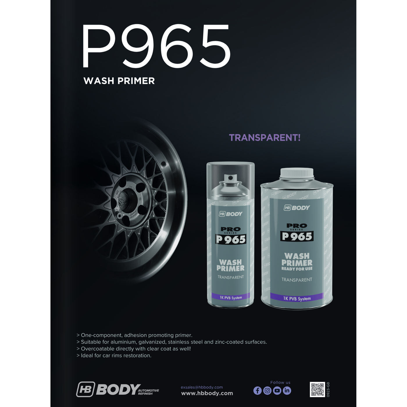 Plánujete renováciu liatych kolies? Ak chcete zachovať pôvodný vzhľad svojich kolies, P965 je produkt pre vás! Na rozdiel od väčšiny základných náterov na báze ľahkých kovov je transparentný. To vám dáva možnosť následne naniesť na kolesá len vysokokvalitný bezfarebný náter ako finálnu vrstvu, vďaka čomu budú kolesá vyzerať ako nové.