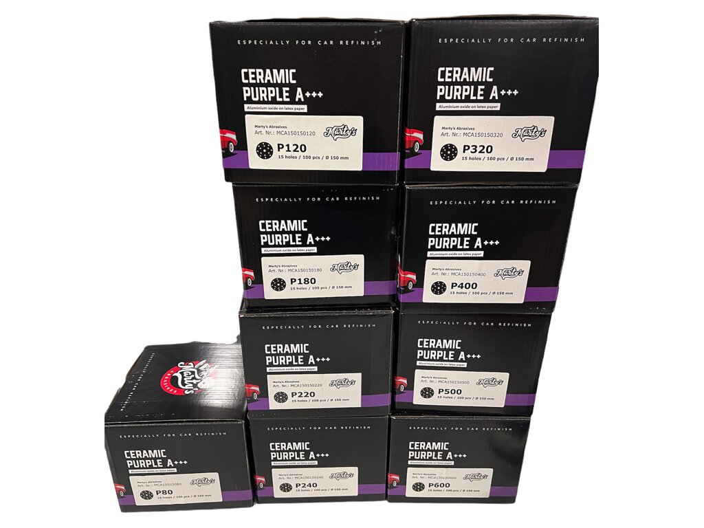 dáva kotúčom vynikajúce vlastnosti. Brúsne kotúče Marty's Ceramic Purple A+++ majú niekoľkonásobne dlhšiu životnosť a sú odolnejšie ako všetky bežné kotúče. Keramické zrno oxidu hlinitého je veľmi ostré a tvrdé, vďaka čomu je vhodné na všetky postupy brúsenia pri opravách automobilov vrátane brúsenia veľmi tvrdých lakov, ako sú keramické, nano alebo poškriabané laky.
