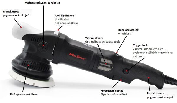 má spúšťací mechanizmus s premenlivou rýchlosťou a funkciou blokovania. Pohodlný a ergonomický tvar konštrukcie - zväčšené pogumované rukoväte. Mimoriadne dlhý a odolný 4 m napájací kábel so zosilnením na najviac namáhaných miestach. Leštička je skonštruovaná tak, aby rok čo rok poskytovala kvalitné a bezproblémové používanie. K leštičke odporúčame dokúpiť leštiace kotúče a pastu.