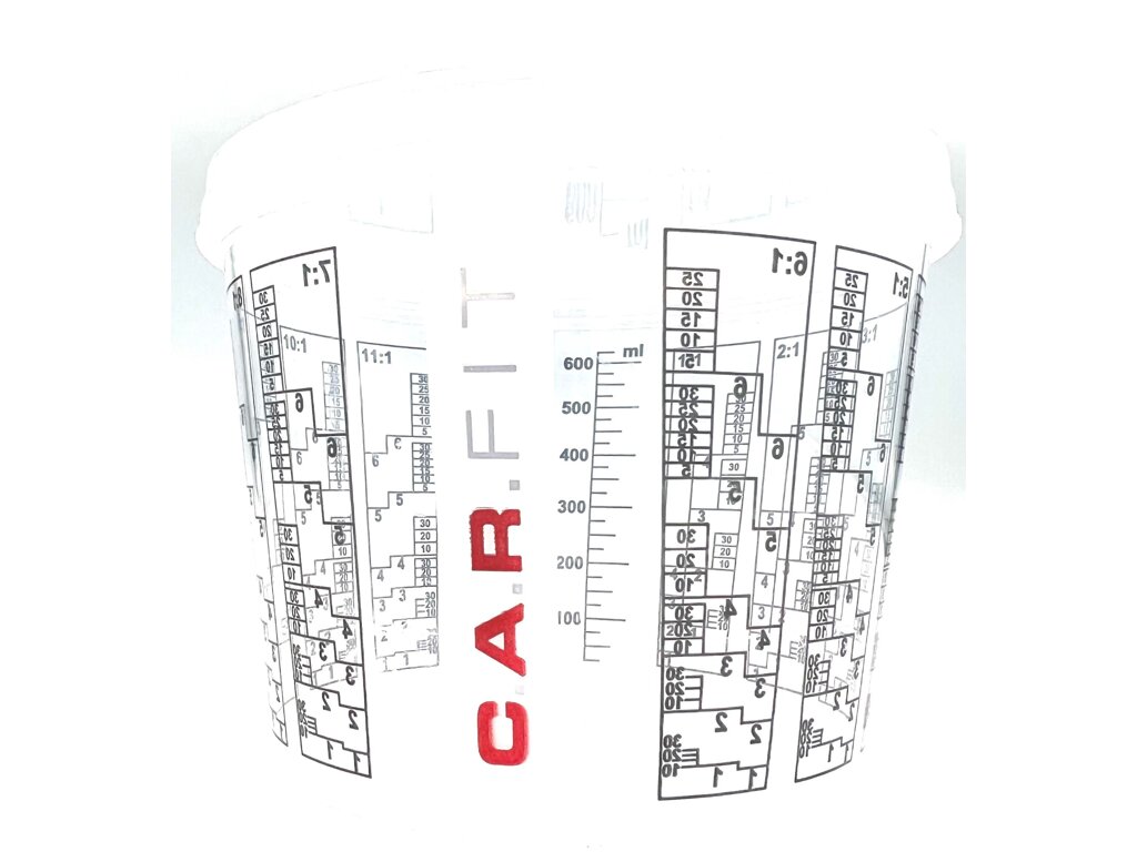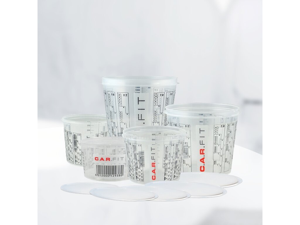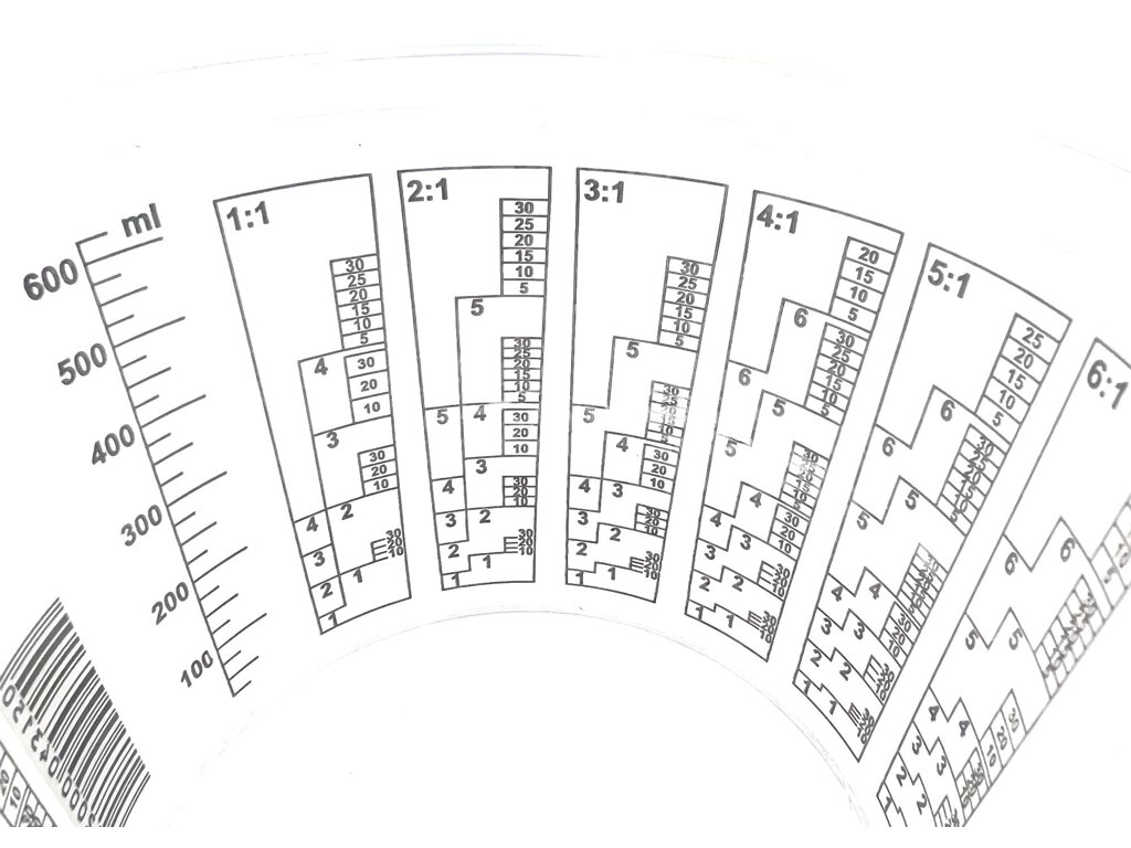 Miešacie poháre používajú odolnú tlačenú grafiku a stupnice na miešanie materiálov s objemovými pomermi 2:1, 3:1, 4:1, 5:1, 6:1, 7:1 až 10:1. Miešacie poháre navyše obsahujú všeobecnú stupnicu.