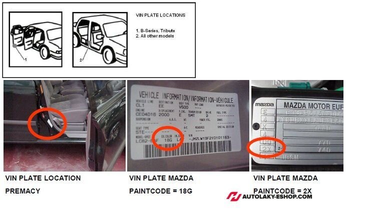 Pri vozidlách Mazda nájdete kód farby vo dverách vodiča alebo spolujazdca alebo v motorovom priestore.
