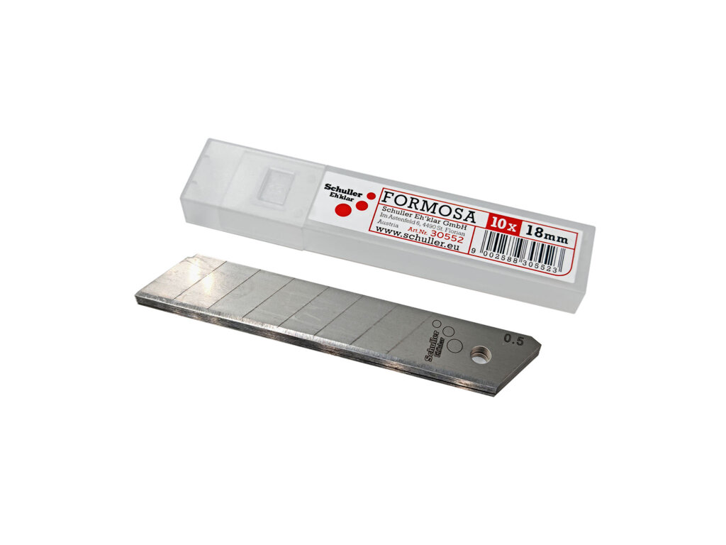 Balenie 10 náhradných čepelí pre odihlovacie nože. Čepele sú univerzálne a možno ich použiť vo všetkých 18 mm vyhadzovacích nožoch tohto typu.