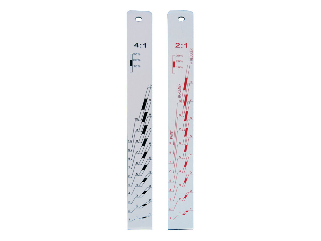 Hliníková odmerka a miešadlo s rôznymi pomermi miešania 2:1/4:1. Vhodná na kontrolu mier, napríklad pri miešaní lakov a tmelov, farieb a riedidiel a i. Dá sa čistiť a opakovane používať.